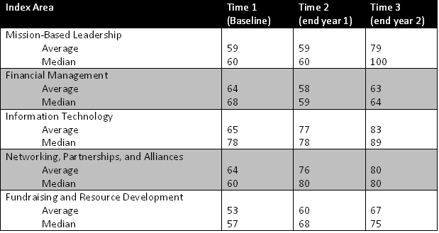 As expected by the program, results from the analysis indicated that index scores were increasing across the cohort. However, in the area of financial management, the scores actually dropped. According to this capacity builder, this was because after the initial assessment, the participating organizations increased their knowledge about the topic and then answered the questions on the assessment differently, realizing that they did not have as many effective financial management practices in place as they initially thought. What could have been interpreted as a “negative” outcome is instead explained as a possible “positive” outcome.