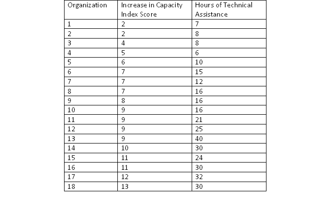 Let’s suppose that the individual capacity index scores for the previous example are compared with the hours of technical assistance each organization received, and were plotted. Why would this be of interest? In many programs, a central theory of capacity building is that more technical assistance yields better results for capacity building. If an organization is measuring capacity through the index scores and measuring the amount of technical assistance in hours, it makes sense to explore the relationship between those sets of data to see what information is available to managers. Contracted evaluators may perform rigorous statistical analysis, including correlation and regression analysis as discussed in the previous section, however, you will see in the chart below that even non-statistically savvy managers can examine the relationships between two variables.