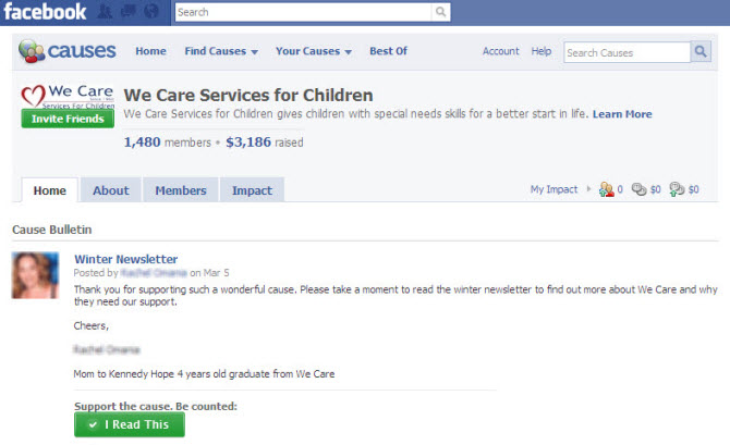 Farther down the page on the "Home" tab, you’ll see a section called "Recent Cause Activity," which displays updates on recent supporter donations. In this area, supporters also have the option to make comments to the group, or post a relevant photo, video, or web link. One supporter on the We Care Services for Children page posted a comment about his past experience as a volunteer for We Care and how it affected his life. Others have posted personal stories about their own family members with special needs and how the We Care organization has helped them.