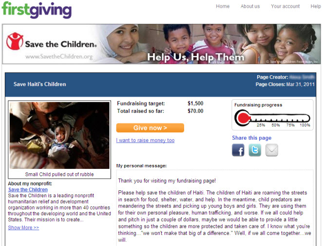 In terms of the page’s look, you’ll see a "Donate" button without having to scroll down at all, which makes it easily accessible to page viewers. Above the "Donate" button are two others: "Spread the Word," which allows you to email the page to friends, and "Start a New Fundraising Campaign," which lets a user set up his or her own page.