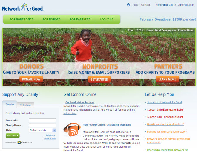 Network for Good is a great choice for organizations that don’t want to commit a lot of time to managing a web fundraising tool. One of the site’s main offerings is a “charity badge,” or a widget that supporters can post elsewhere on the web. The badge links users back to a personal donation page and can be placed in emails, on blogs, or on other websites.
