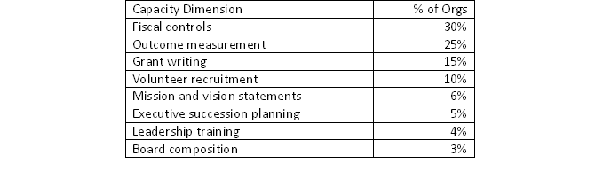 The capacity builder might also be interested in what capacity dimensions saw the most frequent improvements overall. This might help them define future capacity building. The program manager might start by identifying the single biggest area of improvement for each organization: