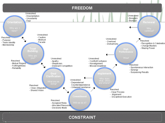 While the design of this model might suggest that “high performance” is a destination that all teams reach, research indicates that many never do. But you don’t have to reach this point for good work to get done. The process outlined in the Drexler/Sibbet model is designed to increase the likelihood of becoming a high-performance team and spending more time in this stage.